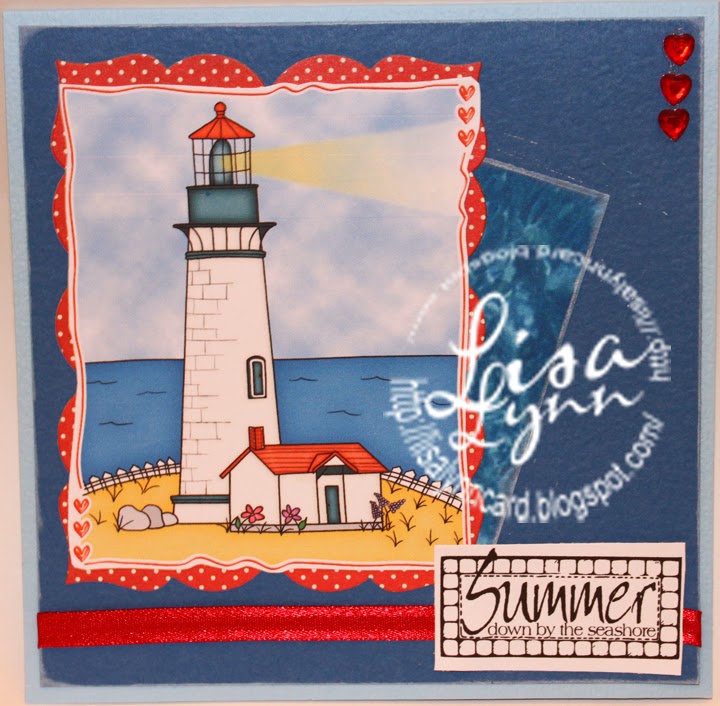 This week on Monday I had a minor surgery to have a biopsy of a nodule removed on my right chest/shoulder area. It was a 3cm area so it was rather large and the area is now rather tender so that is why I haven't been coloring. I have a nice bruise. Luckily, it isn't cancer so I have nothing to complain about. For my card, I used a gorgeous image from Imagine That Lighthouse. The sentiment is from TLC. It reminds me of the beautiful view I just had in the Upper Peninsula of Michigan.
